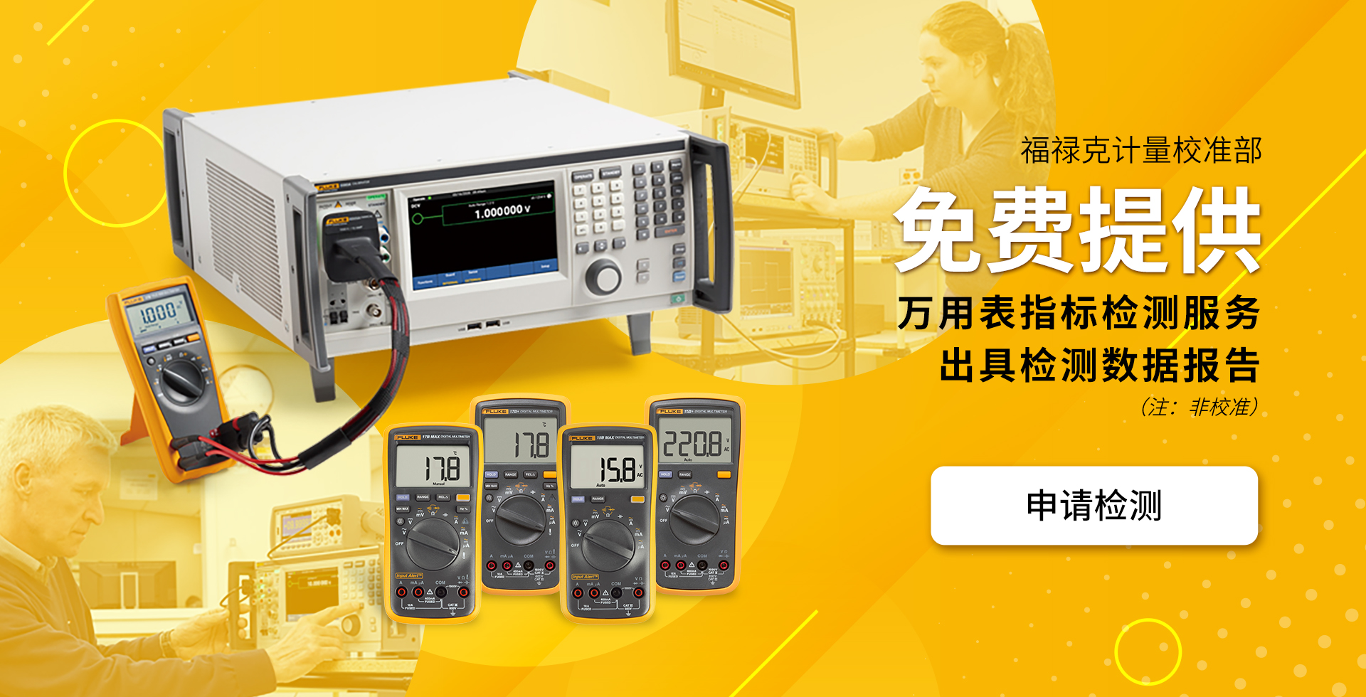 福祿克計(ji)量校準開放實驗(yàn)室免費爲(wei)客戶(hu)提供優(you)質(zhi)的(de)測(ce)試環境全面的(de)計(ji)量校準産(chan)品(pin)、專(zhuan)業的(de)技(ji)術(shù)支持。實驗(yàn)室位于(yu)北京咊(he)上海,滿足各行業電(dian)學(xué)咊(he)熱工(gong)産(chan)品(pin)的(de)計(ji)量校準需求。